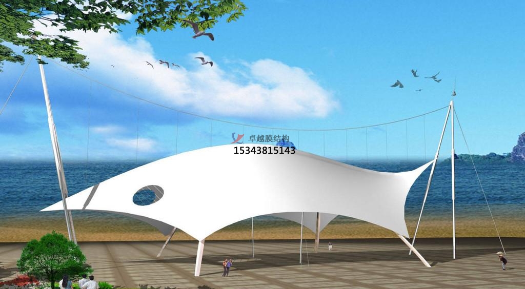 以膜材、鋼索及支柱構(gòu)成,利用鋼索與支柱在膜材中導(dǎo)入張力以達(dá)安 定的形式。除了可實(shí)踐具創(chuàng)意,創(chuàng)新且美觀的造型外,也是比較能展現(xiàn)膜結(jié) 構(gòu)精神的構(gòu)造形式。 大型跨距空間也多采用以鋼索與壓縮材構(gòu)成鋼索網(wǎng)來(lái)支撐上部膜材的形式。因施工精度要求]高,結(jié)構(gòu)性能強(qiáng),且具豐 富的表現(xiàn)力,所以造價(jià)略高于骨架式景觀膜結(jié)構(gòu)遮陽(yáng)棚。