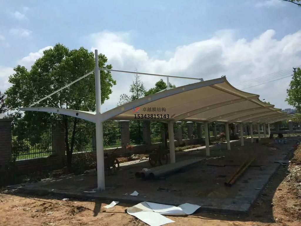 種,張力式膜結(jié)構(gòu)。這種類型的膜結(jié)構(gòu)是采用相對簡單的材料制作而成的,同時(shí)由于這種膜結(jié)構(gòu)本身具有一定的張力,因此稱為張力式膜結(jié)構(gòu)。與傳統(tǒng)的膜結(jié)構(gòu)有所差異的是,主要有兩種柔性材料構(gòu)成它的受力材料,即薄膜和索。在對膜結(jié)構(gòu)進(jìn)行工程設(shè)計(jì)之前我們必須先要了解一下它的組成材料,一般來說,使用在建筑工程上的薄膜材料主要有織物類以及非織物類兩種。前者比較常用的一般主要是PVC膜材以及PTFE膜材,而比較常用的ETFE膜材是在在所有非織物類的薄膜材料中具有代表性的。而不同場地使用的停車棚因?yàn)槠湟笠膊煌?,所以對選擇的膜結(jié)構(gòu)的功能以及設(shè)計(jì)壽命都有所區(qū)別。
