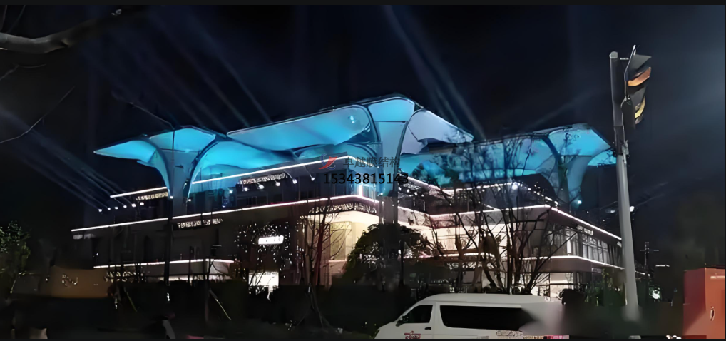 結(jié)合地形設(shè)計觀景臺或空中步道,利用膜材透光性(如ETFE膜)引入自然光線,白天形成動態(tài)光影,夜間通過燈光渲染增強(qiáng)氛圍。
