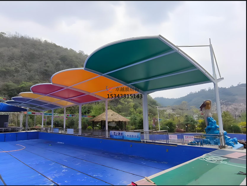 案例 :膜結(jié)構(gòu)遮陽棚采用PVC/PVDF材質(zhì),顏色豐富(如橙色、藍(lán)色),與綠植形成對比,提升公園藝術(shù)性。
