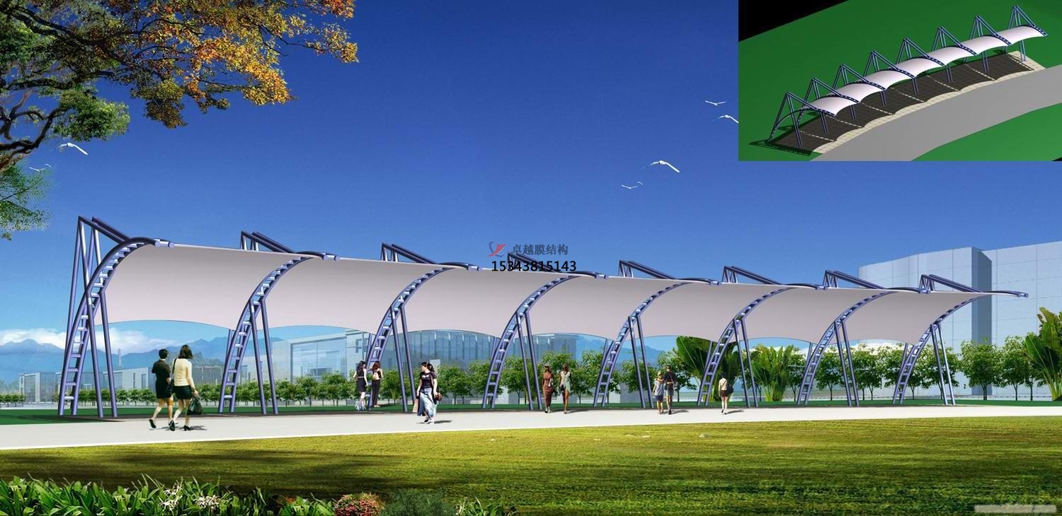 高爾夫球場(chǎng)膜結(jié)構(gòu)景觀特點(diǎn):高爾夫球場(chǎng)膜結(jié)構(gòu)景觀具有輕質(zhì)高強(qiáng)、造型多樣、透光性好、耐候性強(qiáng)、施工快捷、環(huán)保節(jié)能、功能復(fù)合、維護(hù)簡(jiǎn)便等特點(diǎn)。高爾夫球場(chǎng)膜結(jié)構(gòu)景觀采用高強(qiáng)度膜材,重量輕但承載能力出色,能以較小的自重覆蓋較大的跨度,減少支撐結(jié)構(gòu)的需求,降低基礎(chǔ)建設(shè)成本,同時(shí)也減輕了對(duì)球場(chǎng)地面的壓力。膜材的柔性特質(zhì)使其可以塑造出各種流線型、曲面等富有現(xiàn)代感的造型,如馬鞍形、傘形、帳篷形等,為高爾夫球場(chǎng)增添獨(dú)特的視覺效果,提升球場(chǎng)的整體美觀度和藝術(shù)氛圍。部分膜材的透光率可達(dá)20%-40%,白天可以充分利用自然采光,使球場(chǎng)內(nèi)光線充足且柔和,減少人工照明的使用,降低能源消耗;夜晚燈光透射形成獨(dú)特的光影效果,為球場(chǎng)營(yíng)造出浪漫而迷人的氛圍。其表面涂層具備抗紫外線、耐腐蝕、自潔等功能,能夠抵御陽(yáng)光、風(fēng)雨、冰雪等自然環(huán)境的侵蝕,適應(yīng)戶外長(zhǎng)期使用,可保持膜結(jié)構(gòu)的性能和外觀長(zhǎng)期穩(wěn)定,減少維護(hù)成本和頻率。膜結(jié)構(gòu)的預(yù)制化程度高,大部分構(gòu)件在工廠預(yù)制完成后,運(yùn)輸?shù)浆F(xiàn)場(chǎng)進(jìn)行安裝,安裝周期短,對(duì)球場(chǎng)的正常運(yùn)營(yíng)影響小,同時(shí)對(duì)基礎(chǔ)要求相對(duì)較低,可在較短時(shí)間內(nèi)完成景觀建設(shè)。膜材料可回收利用,符合環(huán)保要求;其透光性和隔熱性能有助于減少白天照明能耗和空調(diào)負(fù)荷,還能配合光伏技術(shù),進(jìn)一步提高能源利用效率,實(shí)現(xiàn)節(jié)能減排。膜結(jié)構(gòu)景觀不僅可以作為遮陽(yáng)擋雨的設(shè)施,還能用于劃分球場(chǎng)空間、設(shè)置休息區(qū)、搭建看臺(tái)等,同時(shí)還具有藝術(shù)裝飾功能,提升球場(chǎng)的品質(zhì)和檔次。其表面的自潔涂層使膜面在雨水沖刷下即可保持清潔,減少了清潔頻次,日常只需定期檢查膜材和支撐結(jié)構(gòu)的狀況,如節(jié)點(diǎn)連接是否牢固、膜材是否有破損等,即可保障結(jié)構(gòu)的安全穩(wěn)定。