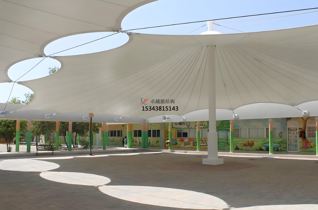 膜材料具有良好的透光性,可以在保證遮陽的同時(shí),讓自然光線柔和地灑入室內(nèi),為孩子們提供充足的日照,有利于他們的視力保護(hù)和身心健康。同時(shí),膜結(jié)構(gòu)的設(shè)計(jì)通常結(jié)合高效的通風(fēng)系統(tǒng),確保室內(nèi)空氣流通,即使在炎熱的夏季也能保持室內(nèi)涼爽,為孩子們創(chuàng)造一個(gè)舒適的學(xué)習(xí)環(huán)境。