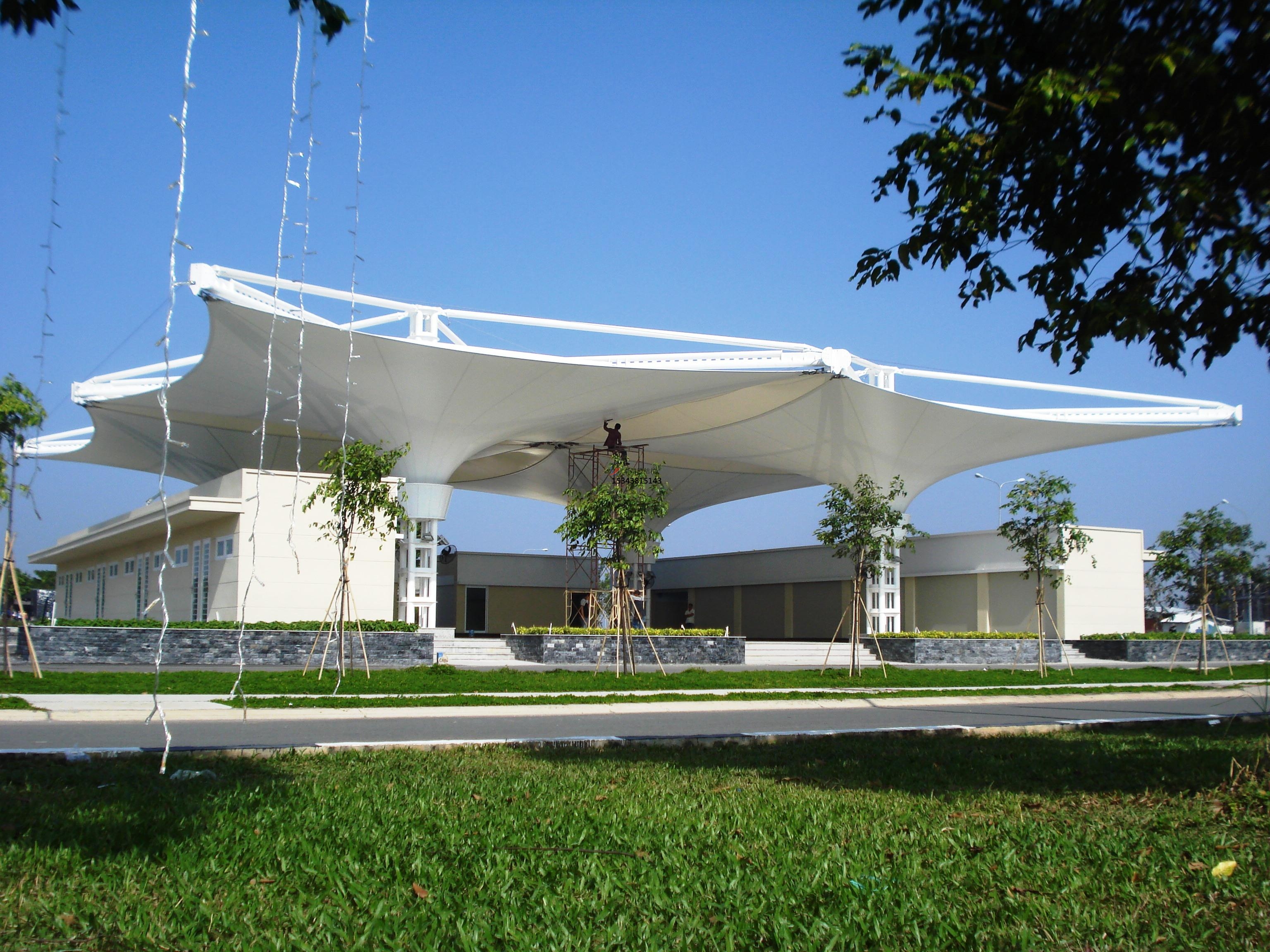 景觀膜結構遮陽棚的一個重要作用就是具有非常強的抗壓功能,抵抗各種天色變化,如日曬、雨淋、風雪、臺風等對其壓力的影響,保持建筑物的結構的韌性、結構的穩(wěn)定性。選定景觀膜結構遮陽棚的膜面的形態(tài)和材料時要考慮到所有可能的天色狀況,并盡可能利用建筑本身等被動方法來減少帶來的風險。為了招架風雪,膜面的外形應使排水通暢使捷,避免在其上形成水兜或雪的堆積。