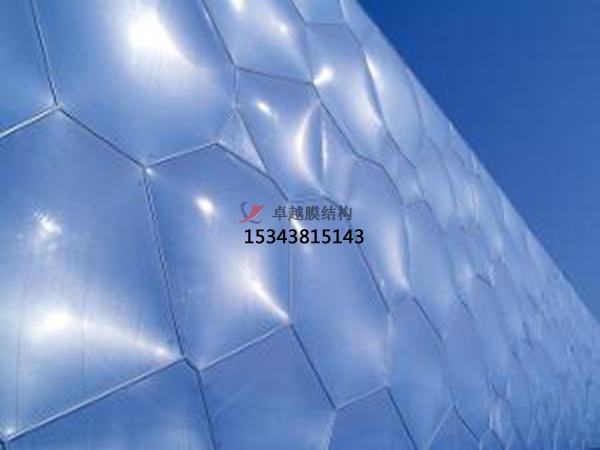 ETFE更早由杜邦公司于七十年代研發(fā),作為一種輕質(zhì)、阻熱的薄膜,可用作航空工業(yè)中的覆蓋層。從那時(shí)起,這種薄膜被零星的應(yīng)用于農(nóng)業(yè)和建筑領(lǐng)域,例如溫室的覆蓋層和太陽能板保護(hù)層。之后,在2001年,這種材料迎來了第次大規(guī)模應(yīng)用,作為英國康沃爾郡“伊甸園計(jì)劃”(Eden Project)巨大圓形溫室的表面膜材料。該項(xiàng)目是巴克敏斯特·富勒(Buckminster Fuller)的蒙特利爾生物圈概念的進(jìn)化版。奧雅那(Arup)作為工程顧問公司,選擇了ETFE,因其可靠的建筑環(huán)境調(diào)節(jié)能力,可以通過在膜上打印特定的紋理并將其層疊來調(diào)節(jié)光照,這對于建立一個(gè)適合特定植物生長的人工氣候是十分必要的。另外,建筑師發(fā)現(xiàn)ETFE的低摩擦系數(shù)可以防止塵土粘附在表面,從而減少維護(hù)成本。