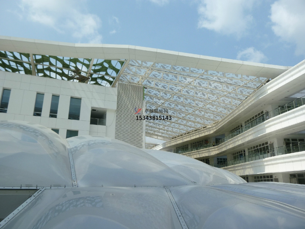 1.造型多變。吳忠ETFE膜結構與其他膜結構稍稍有些不同,它采用一小片一小片的ETFE膜材料安裝在多變的鋼構件中,其造型可根據(jù)鋼構件的造型而變,如:伊甸園的六邊形,水立方的不規(guī)則形狀等,賦予了建筑鮮活的生命,讓人一眼便能記住。