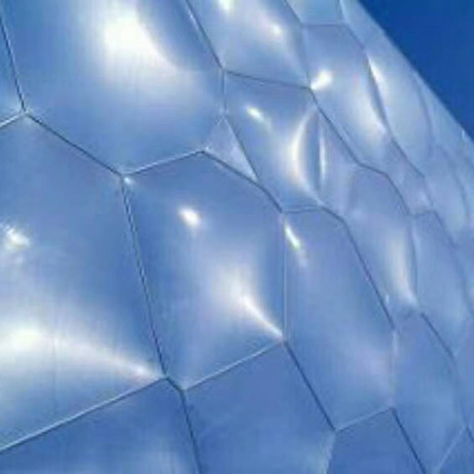 ETFE膜結(jié)構(gòu),為透明白色印花膜,安裝在鋼結(jié)構(gòu)上方,共884塊,總面積近4萬(wàn)平方米。在ETFE膜下方12米的位置,鋪設(shè)的就是第層膜———PTFE膜,顏色為乳白色,懸空吊在鋼結(jié)構(gòu)上。