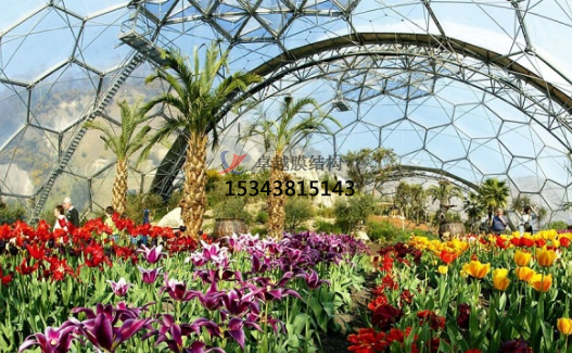 為了滿足室內(nèi)植物的采光條件,該館穹頂全部采用輕盈的ETFE膜覆蓋,“三膜兩腔”的膜結(jié)構(gòu)充氣后就像一個(gè)巨大的泡泡,通過充氣量的多少來調(diào)節(jié)室內(nèi)溫度,從而營造一個(gè)節(jié)能、環(huán)保、可持續(xù)的熱帶植物 “成長樂園”。