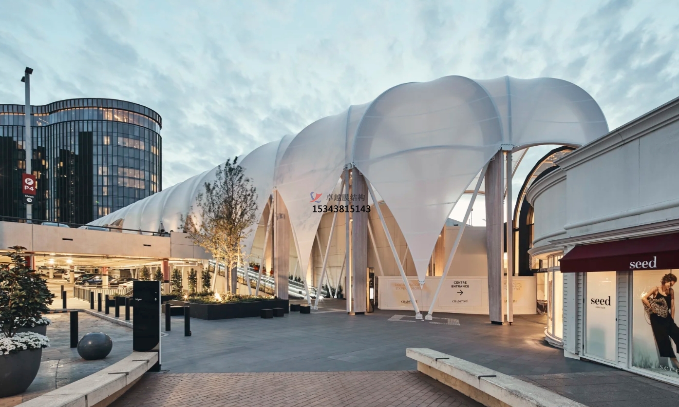 商業(yè)購(gòu)物中心的主要特點(diǎn)是因商業(yè)店鋪的集中而形成了室內(nèi)室外購(gòu)物、休閑、餐飲等功能空間,步行街及中央活動(dòng)區(qū)域是人們行走、休息、交流的開放空間,基于商業(yè)街特色,就決定了所有設(shè)計(jì)的核心就是讓空間更具人性化。屋頂作為建筑附加設(shè)施,不僅要求遮陽(yáng)避雨的實(shí)用功能,也應(yīng)該是錦上添花的設(shè)施。目前國(guó)內(nèi)外膜結(jié)構(gòu)應(yīng)用于商業(yè)綜合體的工程案例越來越多,膜結(jié)構(gòu)建造的屋頂擁有很多傳統(tǒng)屋頂所不具備的優(yōu)勢(shì)特點(diǎn)。