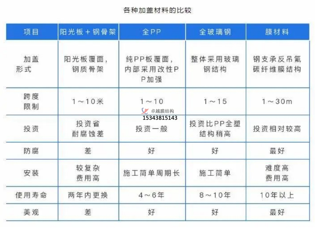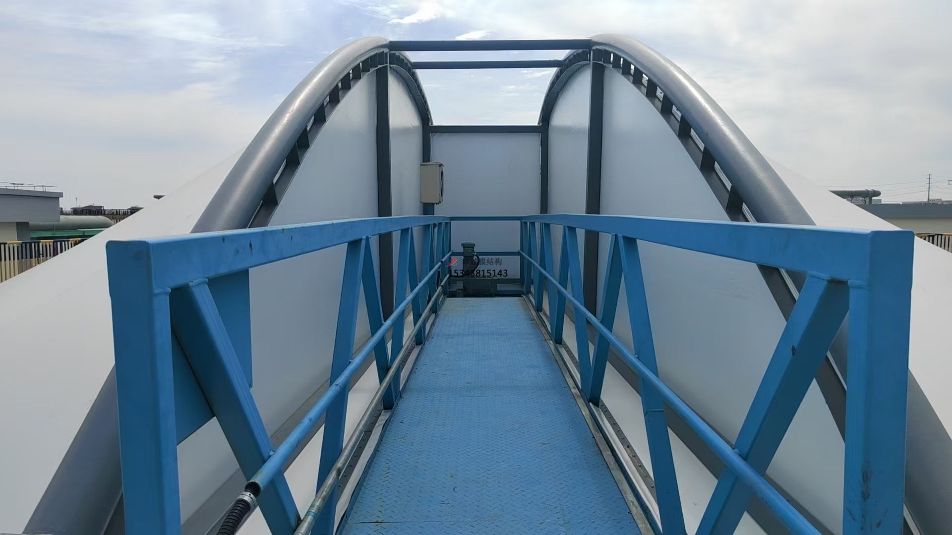 加蓋的方式有兩種,一種是加高蓋,一種是加低蓋。加高蓋的具體做法是在需加蓋的構(gòu)筑物上加一個(gè)高度約1~5m的大蓋,將所有的池面、設(shè)備均罩在里面(走道板外挑可以不罩在里面);加低蓋的具體做法是在構(gòu)筑物水面上加一個(gè)高度不超過2m的蓋,將所有的走道、設(shè)備均露在蓋外,僅將污水水面罩住。