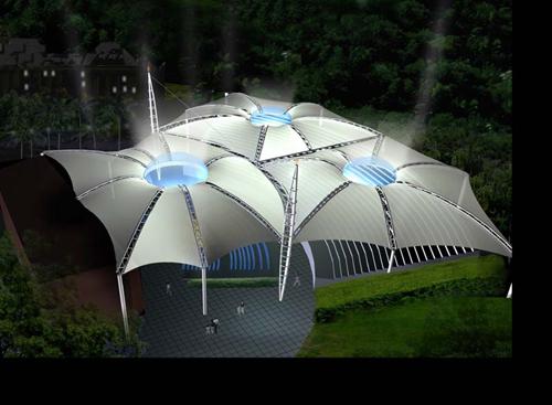 No.1?膜結構屋面安全性要求非常高,而PTFE膜結構材料更大的魅力在于它強度高、耐久性好、防火難燃、自潔性好,不受紫外線影響,使用壽命在25年以上。具有高透光率,透光率為13%, 對熱能反射率73%,PTFE膜熱吸收量很少。PTFE膜材讓膜結構屋面有成為現(xiàn)代化的永久性建筑。