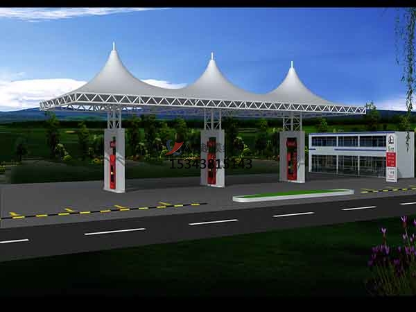 加油站膜結(jié)構(gòu),荷載態(tài)分析:張拉膜結(jié)構(gòu)自身重量很輕,僅為鋼結(jié)構(gòu)的1/5,混凝土結(jié)構(gòu)的1/40;因此膜結(jié)構(gòu)對(duì)地震力有良好的適應(yīng)性,而對(duì)風(fēng)的作用較為敏感。此外還要考慮雪荷載和活荷載的作用。