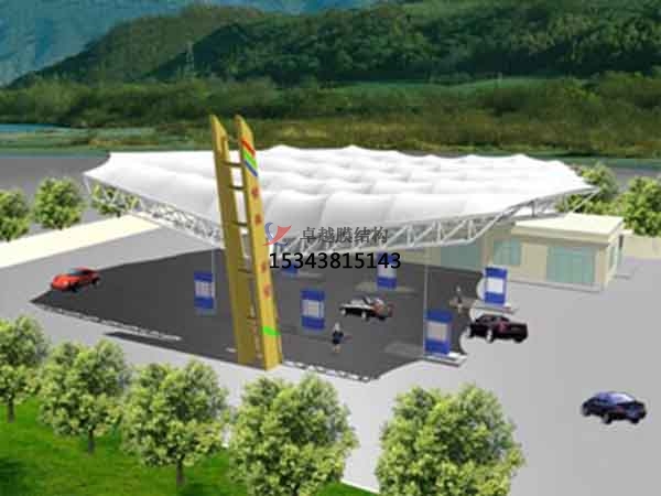一、造型獨(dú)特,辨識度高,由于膜材重量輕,適合加油站這種大跨度的建筑,而且是采用張力結(jié)構(gòu)所以在造型設(shè)計上具有很大的優(yōu)勢,可以實現(xiàn)非常具有藝術(shù)氣息的造型。