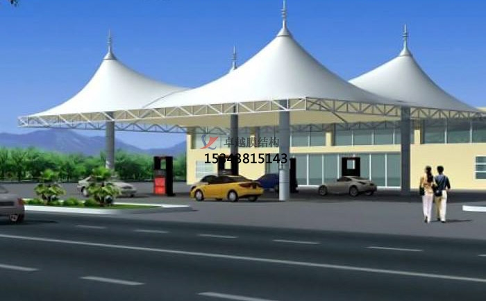 尖頂加油站張拉膜結(jié)構(gòu)效果圖展,常見(jiàn)的加油站張拉膜結(jié)構(gòu)是尖頂?shù)木佣?,白色pvc材質(zhì)的膜也是居多,看上去干凈整潔,而且是阻燃材料,防火,防潮,使用周期久,易于護(hù)理和維護(hù),也是成為眾多加油站的不二之選。