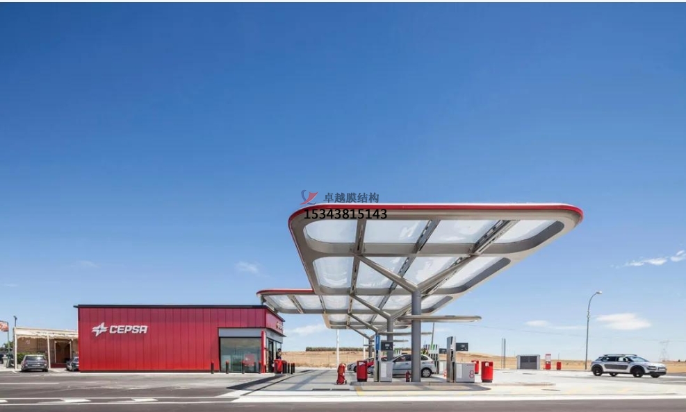 2、藝術(shù)性:除了一般雨蓬不可比擬的實(shí)用、耐用、遮風(fēng)擋雨的功能外,加油站膜結(jié)構(gòu)雨蓬更是一座雕塑,一件藝術(shù)品,給人美的視覺享受。其柔美,其曲線,其剛?cè)岵?jì),其豐富造型,其潔白無(wú)瑕,讓人眼前一亮,回味悠長(zhǎng)。