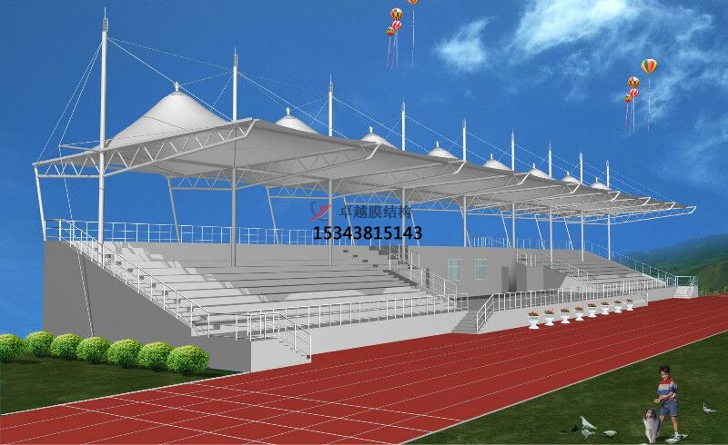 張拉膜看臺主要用于各類地方體育場主席臺雨棚,各類學校體育場看臺雨棚遮蓋,我公司是國內(nèi)較早從事大懸挑張拉膜結(jié)構(gòu)看臺設(shè)計施工的專業(yè)廠家,下面介紹一下我們在北京市周邊縣市完工的一些張拉膜看臺設(shè)計施工案例,我公司先后在北京周邊承接了北京市第八中學張拉膜看臺雨棚、北京市第四中學張拉膜張拉膜看臺罩棚、北京中學張拉膜看臺遮陽棚等設(shè)計施工項目,簡介如下: