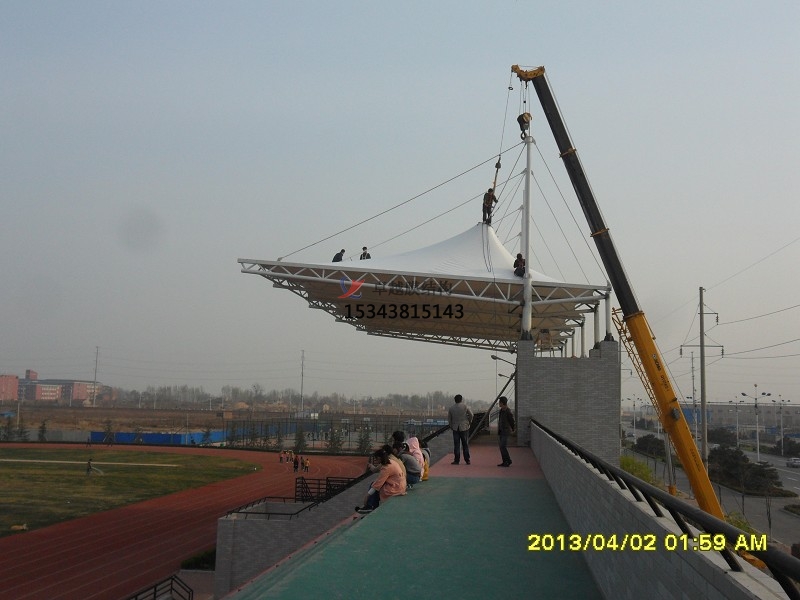膜片的裁剪制作、鋼索及鋼結(jié)構(gòu)等制作均在工廠內(nèi)完成,可與下部鋼筋混凝土結(jié)構(gòu)或構(gòu)件等同時(shí)進(jìn)行,在施工現(xiàn)場只是鋼索、鋼結(jié)構(gòu)及膜片的連接安裝定位及張拉的過程,故在現(xiàn)場的施工安裝比較文明、迅速快捷。