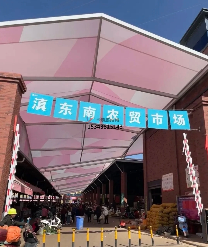 膜材差異:不同膜材價(jià)格懸殊。PVC 膜材價(jià)格相對較低,每平方米在 200 - 500 元不等,適合預(yù)算有限、對性能要求相對不高的小型農(nóng)貿(mào)市場;PTFE 膜材價(jià)格高昂,每平方米可達(dá) 1000 - 3000 元,常用于追求高品質(zhì)、長壽命的大型或重要農(nóng)貿(mào)市場項(xiàng)目。