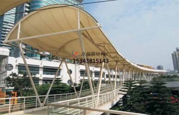 以膜材、鋼索及支柱構(gòu)成,利用鋼索與支柱在膜材中導(dǎo)入張力以達安 定的形式。除了可實踐具創(chuàng)意,創(chuàng)新且美觀的造型外,也是能展現(xiàn)膜結(jié) 構(gòu)精神的構(gòu)造形式. 大型跨距空間也多采用以鋼索與壓縮材構(gòu)成鋼索網(wǎng)來支撐上部膜材的形式。因施工精度要求高,結(jié)構(gòu)性能強,且具豐 富的表現(xiàn)力,所以造價略高于骨架式膜結(jié)構(gòu)景觀。