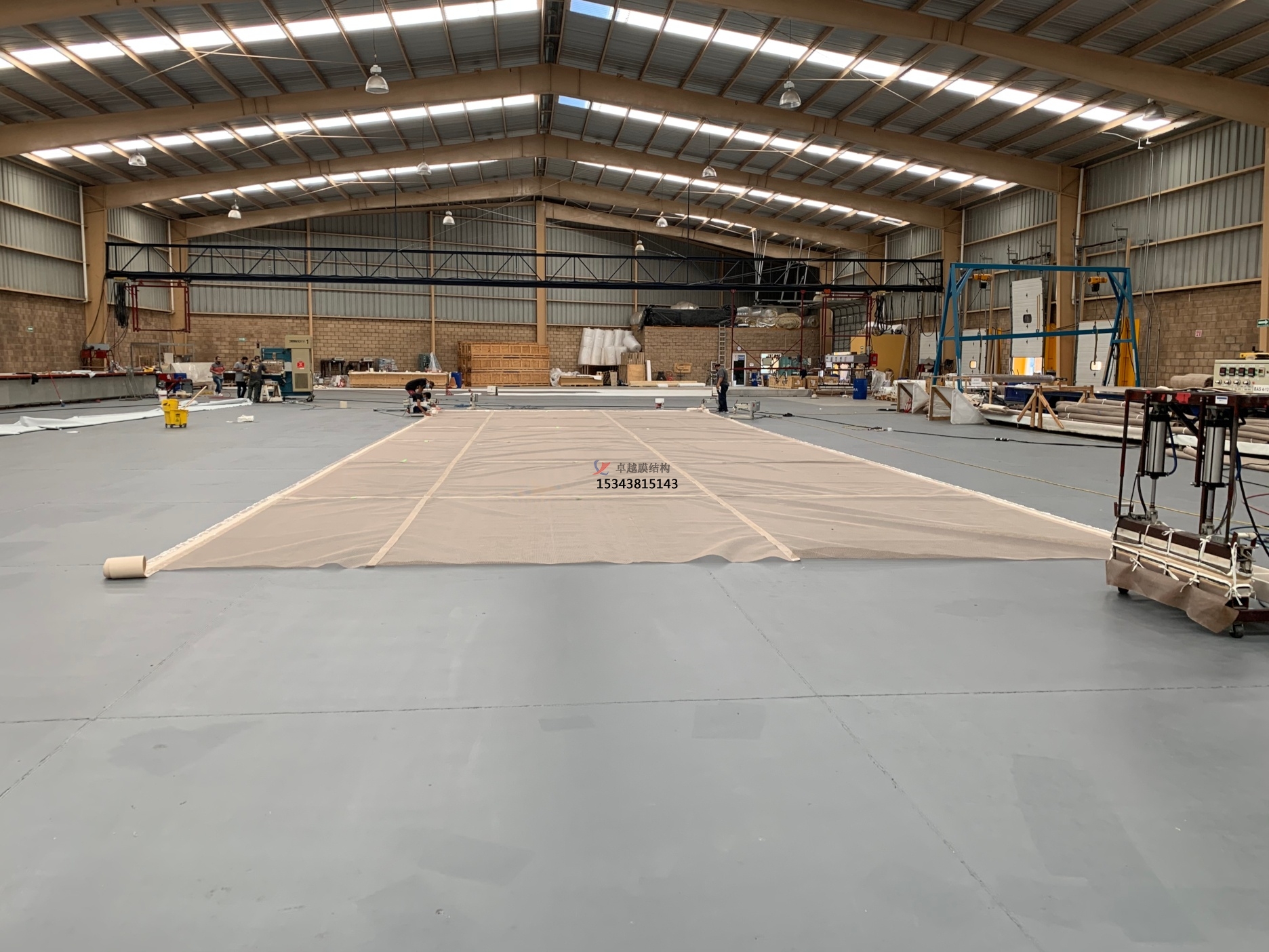 膜結(jié)構(gòu)工程的加工制造膜材的首要加工流程包含: 進(jìn)料-查驗(yàn)?zāi)げ?膜片下料-編號-膜片編排放樣-膜片初粘-駁接-包裝。因?yàn)槟げ牡牟眉簟b進(jìn)程都較為復(fù)雜, 各種角度改變較多, 且加工精度請求非常高, 所以在制造進(jìn)程中要加強(qiáng)質(zhì)量管理, 保證制造精度。