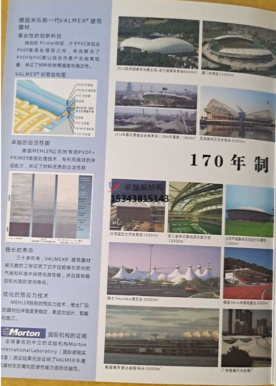 德國MEHLERHAKU米樂公司擁有165年(1837年一2003年)的制造業(yè)經(jīng)驗。通過1S09001質(zhì)量體系認(rèn)證,所有產(chǎn)品均經(jīng)過嚴(yán)格的DIN德國工業(yè)標(biāo)準(zhǔn),以及各個國家的膜材工業(yè)標(biāo)準(zhǔn)。2002年,德國米樂公司獲聘為中華人民共和國建設(shè)部《索膜建筑結(jié)構(gòu)制品》行業(yè)標(biāo)準(zhǔn)編制委員成員。德國米樂的產(chǎn)品系列涵蓋環(huán)保等各種PVC膜材領(lǐng)域,包括:建筑工程、輕型結(jié)構(gòu)、廣告、遮陽、汽艇、軍用、裝飾、水利環(huán)保,等等。