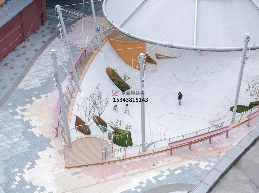 “浮庭”由上方如同水母般漂浮的半透明織物膜結構與下方懸浮感的地景花園共同組成。膜結構既成為了廣場的頂蓋,形成包覆與洞天的感受,也作為織連體引導主要流線銜接了室外幾個重要節(jié)點。結合原混凝土柱的加寬基礎上支起鋼柱,以懸吊與支承合作的形式將膜結構撐起,減少了廣場中結構的出現。
