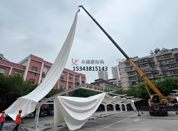 安裝過程:安裝過程分別是鋼結(jié)構(gòu)的安裝,膜材的安裝和附件安裝。鋼結(jié)構(gòu)的安裝會根據(jù)設(shè)計(jì)要求進(jìn)行鋼結(jié)構(gòu)基礎(chǔ)的施工,確?;A(chǔ)的尺寸、位置、標(biāo)高符合設(shè)計(jì)要求,做到表面光滑、無變形、無損傷。鋼結(jié)構(gòu)的安裝位置必須準(zhǔn)確,將鋼結(jié)構(gòu)構(gòu)件在地面進(jìn)行預(yù)組裝,檢查各構(gòu)件的連接是否準(zhǔn)確、牢固,使用專業(yè)的吊裝設(shè)備,如起重機(jī)等,按照預(yù)定的吊裝方案進(jìn)行操作,確保鋼結(jié)構(gòu)的安裝位置準(zhǔn)確。要隨時進(jìn)行測量和調(diào)整,保證鋼結(jié)構(gòu)的垂直度、水平度和跨度等符合設(shè)計(jì)要求。采用焊接、螺栓連接等方式將鋼結(jié)構(gòu)構(gòu)件連接固定,確保連接的強(qiáng)度和可靠性。焊接時,要嚴(yán)格控制焊接質(zhì)量,避免出現(xiàn)焊接缺陷。膜材的安裝過程,膜面的尺寸和形狀必須符合設(shè)計(jì)要求,表面干凈、無損傷。膜材在安裝現(xiàn)場按照預(yù)定的方向和位置展開,同時應(yīng)注意避免膜材與地面或其他物體摩擦、劃傷。使用專用的夾具或繩索將膜材固定在鋼結(jié)構(gòu)上,初步調(diào)整膜材的位置,使其與鋼結(jié)構(gòu)的連接點(diǎn)對齊。進(jìn)行逐步且均衡的膜面張拉,張拉過程要均勻、緩慢地進(jìn)行,施加適當(dāng)?shù)念A(yù)張力,同時要根據(jù)膜材的實(shí)際情況,對張拉力進(jìn)行適當(dāng)?shù)恼{(diào)整,保證膜材表面平整、光滑,無褶皺、松弛等現(xiàn)象,使其達(dá)到設(shè)計(jì)要求。在膜材張拉到位后,使用專用的固定件將膜材牢固地固定在鋼結(jié)構(gòu)上。固定件的間距和安裝方式要符合設(shè)計(jì)要求,確保膜材在使用過程中不會出現(xiàn)松動或位移。附件安裝,附件的安裝包括排水系統(tǒng)安裝,遮陽設(shè)施安裝和安全設(shè)施安裝。安裝膜結(jié)構(gòu)的排水槽、落水口等排水設(shè)施,確保雨水能夠順利排出,避免在膜面形成積水。排水系統(tǒng)的安裝要保證密封性和排水順暢性。如果膜結(jié)構(gòu)設(shè)計(jì)有遮陽要求,安裝相應(yīng)的遮陽簾、遮陽網(wǎng)等遮陽設(shè)施。遮陽設(shè)施的安裝要牢固可靠,能夠滿足遮陽和使用功能的要求。安裝必要的安全設(shè)施,如欄桿、安全網(wǎng)等,確保人員在膜結(jié)構(gòu)區(qū)域內(nèi)的安全。