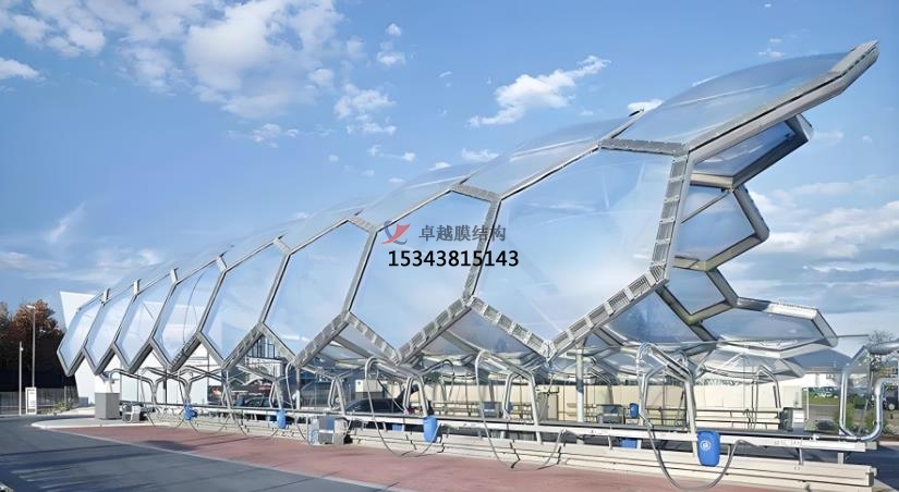 以下是膜結(jié)構(gòu)產(chǎn)品的主要應(yīng)用和特點(diǎn):膜結(jié)構(gòu)自行車棚和機(jī)動(dòng)車棚,膜結(jié)構(gòu)景觀,膜結(jié)構(gòu)污水池加蓋,膜結(jié)構(gòu)體育場(chǎng)館和展會(huì)建筑,膜結(jié)構(gòu)藝術(shù)裝置,膜結(jié)構(gòu)充電樁和收費(fèi)站。膜結(jié)構(gòu)自行車棚采用輕質(zhì)且堅(jiān)固的膜材料,具備優(yōu)異的抗風(fēng)、抗雨雪能力,同時(shí)具有自潔性,減少維護(hù)成本。其優(yōu)雅的造型和多樣的色彩選擇,使其成為城市中的一道靚麗風(fēng)景線,而機(jī)動(dòng)車棚的篷布采用PVC、PVDF、PTFE、ETFE等材料,具有高強(qiáng)度、耐久性好、防火難燃、自潔性強(qiáng)等特點(diǎn)。其透光率為13%,熱能反射率為73%,能有效減少熱吸收,使用壽命可達(dá)15-30年4。膜結(jié)構(gòu)景觀是一種耐用、高強(qiáng)度的涂層織物,具有柔韌的質(zhì)地、重量輕、透光性極佳等特點(diǎn),常被用于公園、廣場(chǎng)等場(chǎng)所,成為吸引眼球的藝術(shù)景觀。隨著工業(yè)污染的加劇,膜結(jié)構(gòu)污水池加蓋因其環(huán)保、施工簡(jiǎn)便等優(yōu)勢(shì),逐漸成為工業(yè)污水處理的首選。其鋼材料使用量少,能有效解決池體跨度過大的施工難題。膜結(jié)構(gòu)在體育場(chǎng)館和展會(huì)建筑中的應(yīng)用,不僅縮短了建設(shè)工期,降低了造價(jià)成本,還減少了環(huán)境污染。其大跨度的設(shè)計(jì)和高透光性,為場(chǎng)館提供了良好的采光和空間感。膜結(jié)構(gòu)藝術(shù)裝置設(shè)計(jì)簡(jiǎn)單、造型獨(dú)特,不僅具有藝術(shù)展示效果,還能為人們提供休息場(chǎng)所,廣泛應(yīng)用于公園、景區(qū)等場(chǎng)所。膜結(jié)構(gòu)充電樁和收費(fèi)站以其耐用性和美觀性,成為現(xiàn)代城市基礎(chǔ)設(shè)施的重要組成部分,為人們提供便捷服務(wù)的同時(shí),也大大提升了城市形象。
