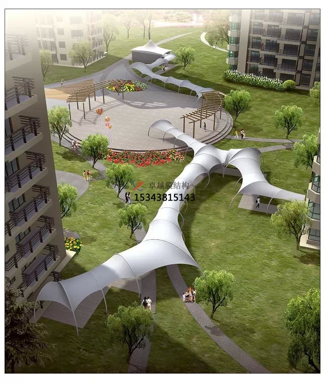 咱們都知道張拉膜是鋼索從邊上穿過,拉出幾個角并固定在不同的高度之上,會構(gòu)成凹凸落差,這樣的落差看起來是很美好的,相對的打開面積就會大許多,由于在占地面積的暗影中,實踐許多是堆疊不筆直的。
