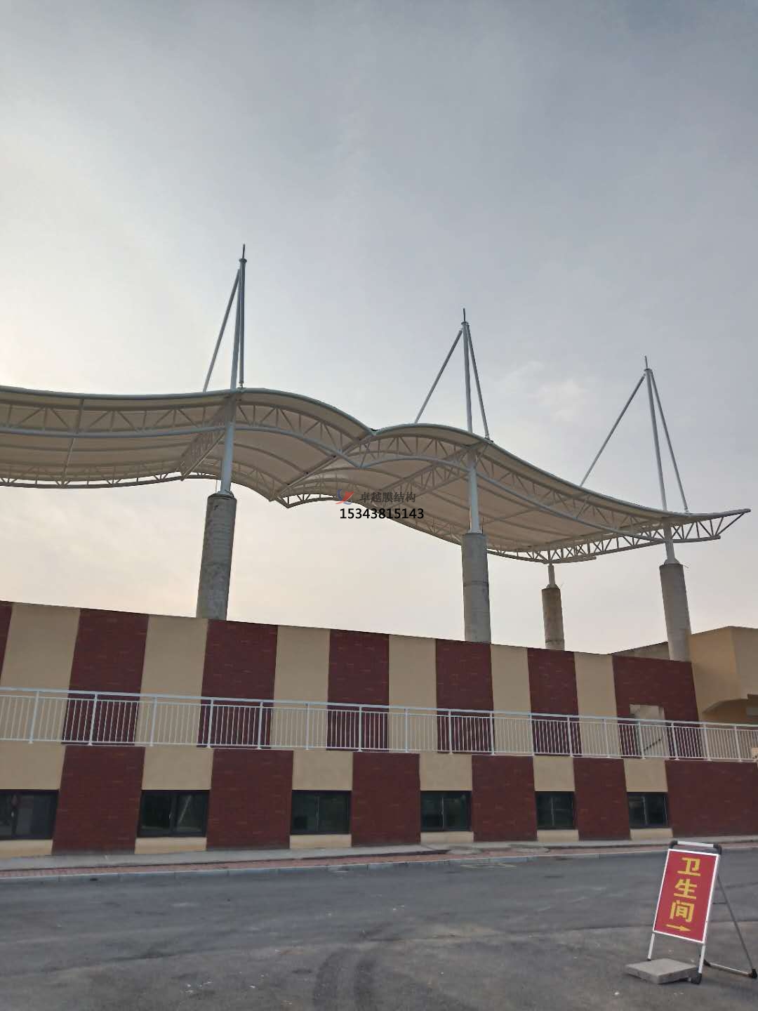 膜結(jié)構(gòu)看臺(tái)在體育設(shè)施上主要應(yīng)用在學(xué)校操場(chǎng)運(yùn)動(dòng)看臺(tái)或主席臺(tái)屋頂,另外大型體育場(chǎng)館看臺(tái)膜結(jié)構(gòu)屋頂也屢見(jiàn)不鮮。看臺(tái)造型般由貝殼形峰膜及部張拉膜組成,形式新穎活潑。膜結(jié)構(gòu)看臺(tái)將鋼架、索、膜巧妙結(jié)合,通過(guò)薄膜、膜邊索、脊索、谷索、拉索、拉桿及定的格構(gòu)梁來(lái)穩(wěn)定。膜頂平滑過(guò)渡,結(jié)構(gòu)美觀、輕巧、整體造型相互輝映,別具格。