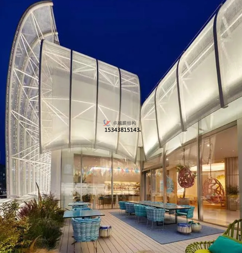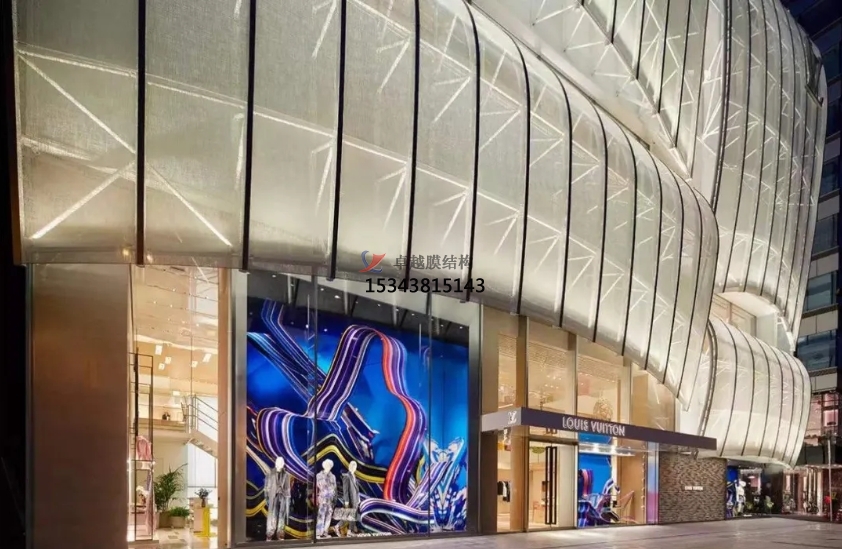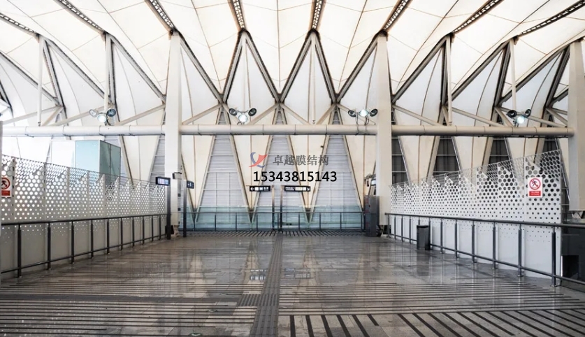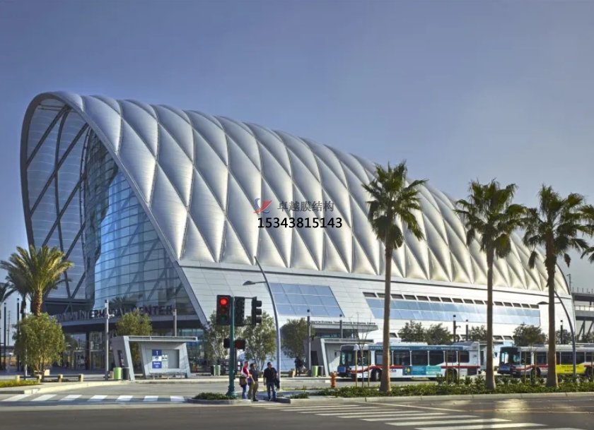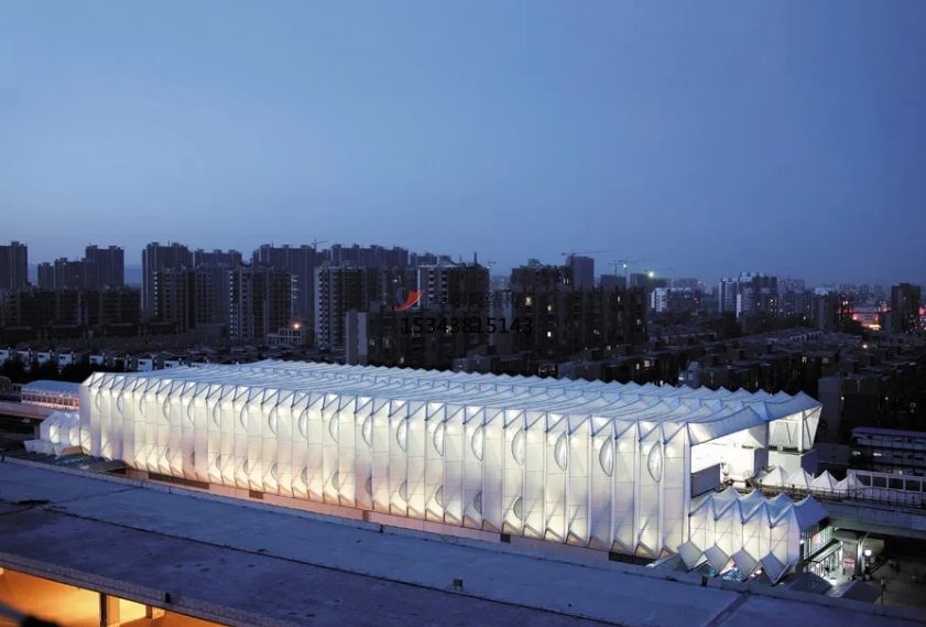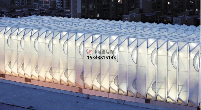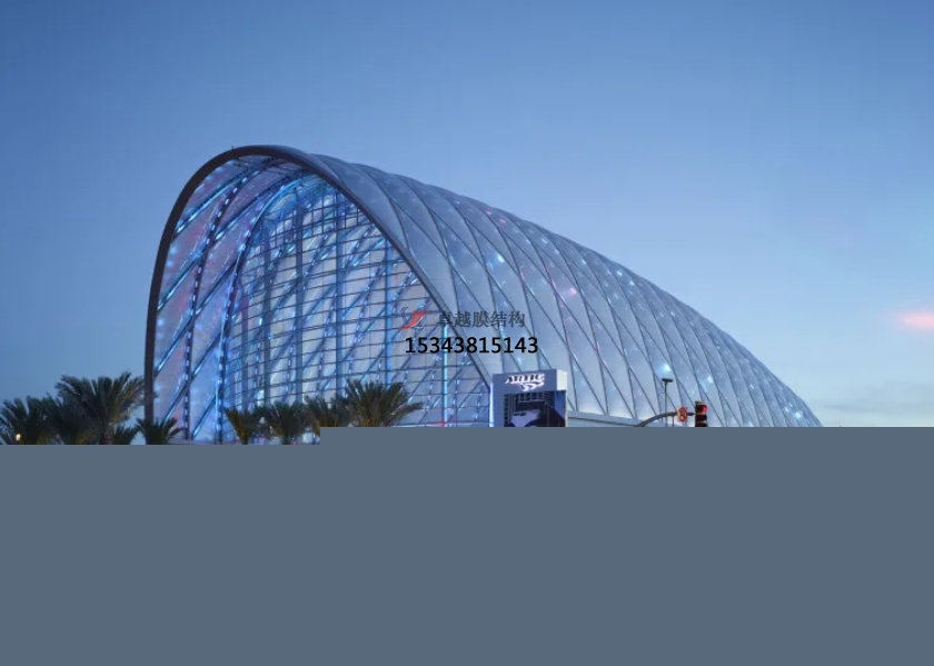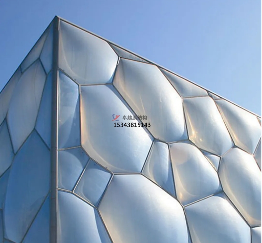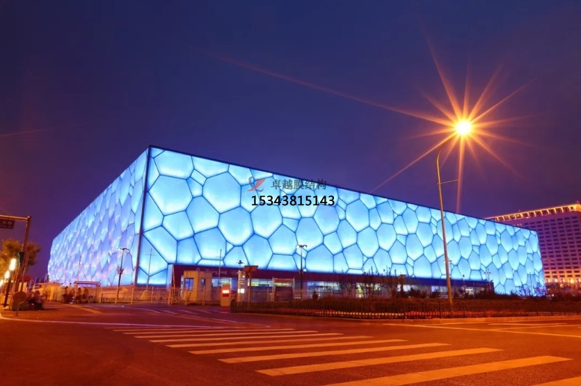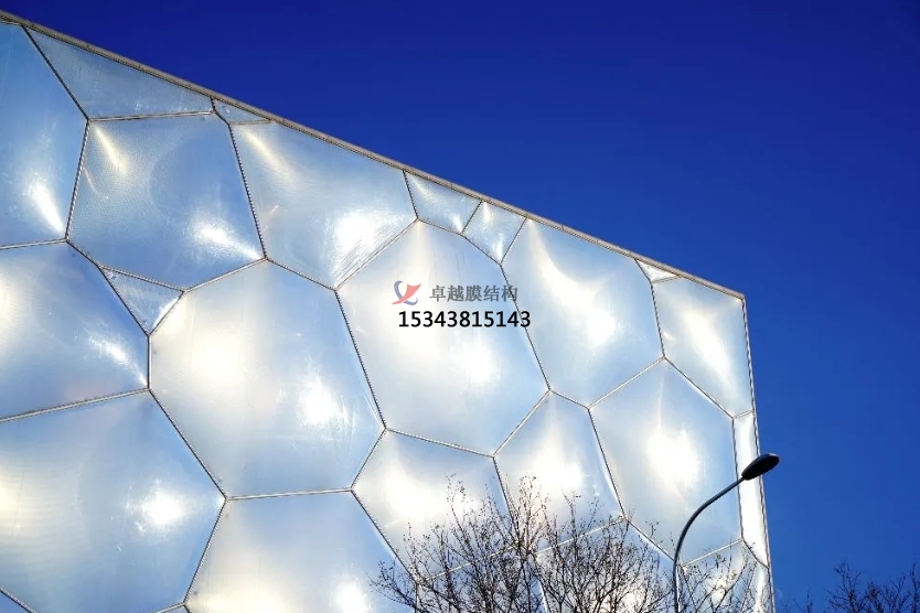 膜結(jié)構(gòu)使得建筑輕盈感十足,膜材料的良好透性使得建筑界面透光而不透視。由于該材料(ETFE)氣枕在陽(yáng)光底下富有通透感光線(xiàn)可以通過(guò)漫射和折射進(jìn)入界面,讓膜結(jié)構(gòu)建筑呈現(xiàn)出朦朧夢(mèng)幻之美。