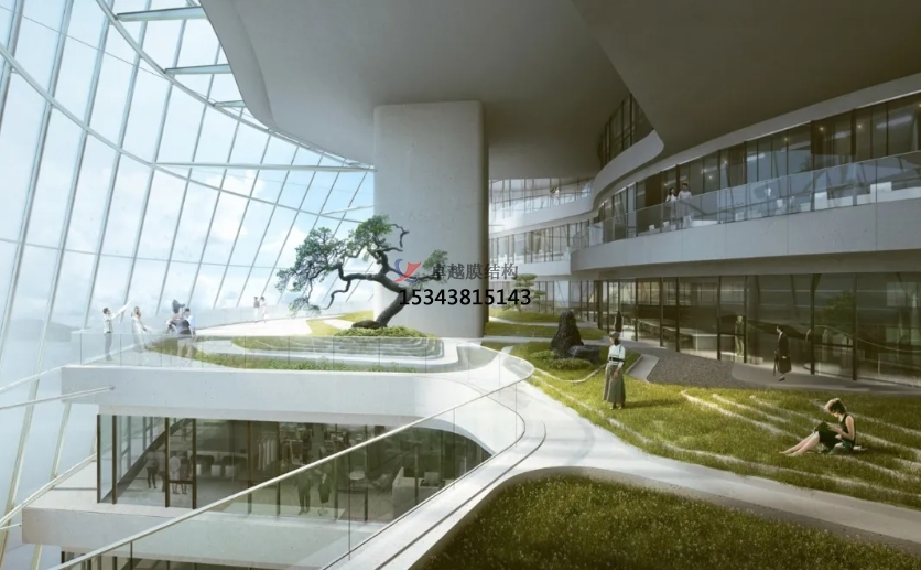 該建筑的采用 PTFE 膜材使得設(shè)計(jì)中心是一座適合當(dāng)?shù)貧夂虻母咝芫G色建筑。特制的半透明遮陽(yáng)膜,設(shè)計(jì)透光率為40%,既降低了建筑的太陽(yáng)輻射,又給辦公空間提供了充分柔和的自然光。