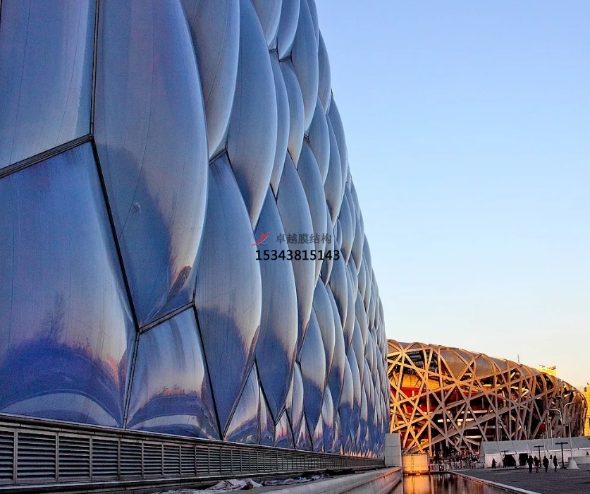 基于“泡沫”的設(shè)計(jì)靈感,設(shè)計(jì)師為“方盒子”包裹上了一層建筑外皮,上面布滿(mǎn)了酷似水分子結(jié)構(gòu)的幾何形狀;通過(guò)覆蓋的ETFE 透明膜賦予了建筑冰晶狀的外貌,使其具有獨(dú)特的視覺(jué)效果和感受,輪廓和外觀因此變得柔和,水的神韻在建筑中得到了完美的體現(xiàn)。