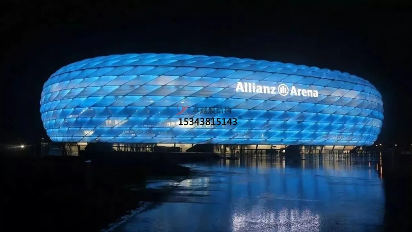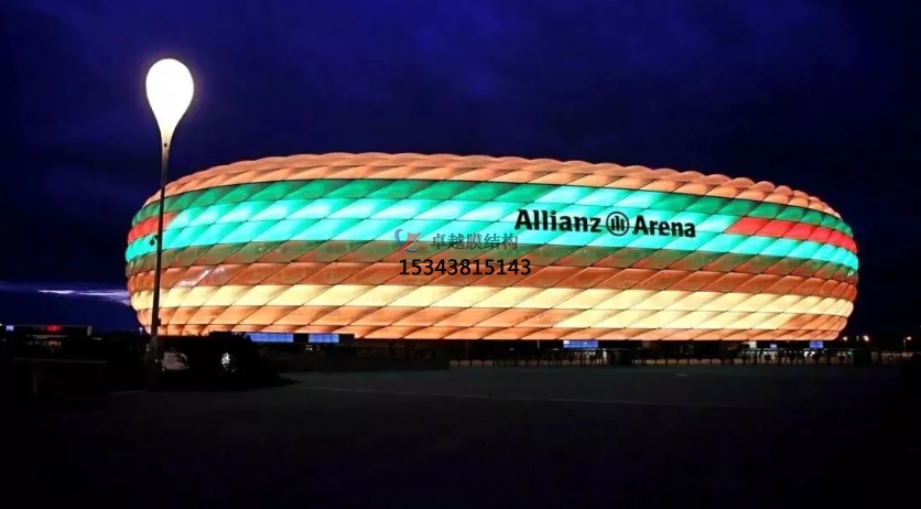 安聯(lián)球場(chǎng)的外墻由許多個(gè)ETFE氣枕構(gòu)成,內(nèi)嵌發(fā)光系統(tǒng),超過三十萬個(gè)LED燈可在夜晚組成1600 萬種顏色圖形。它是世界上最早能實(shí)現(xiàn)變色的球場(chǎng)。由于每個(gè)表皮構(gòu)建有34度的斜角,即使身處最高層看臺(tái)也能提供同樣棒的視覺效果。