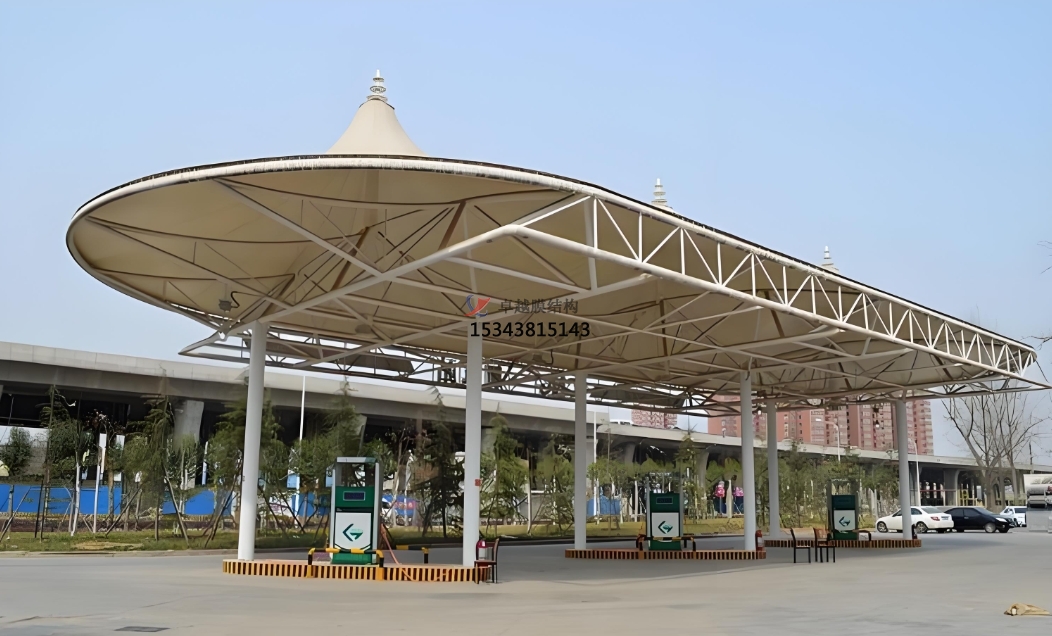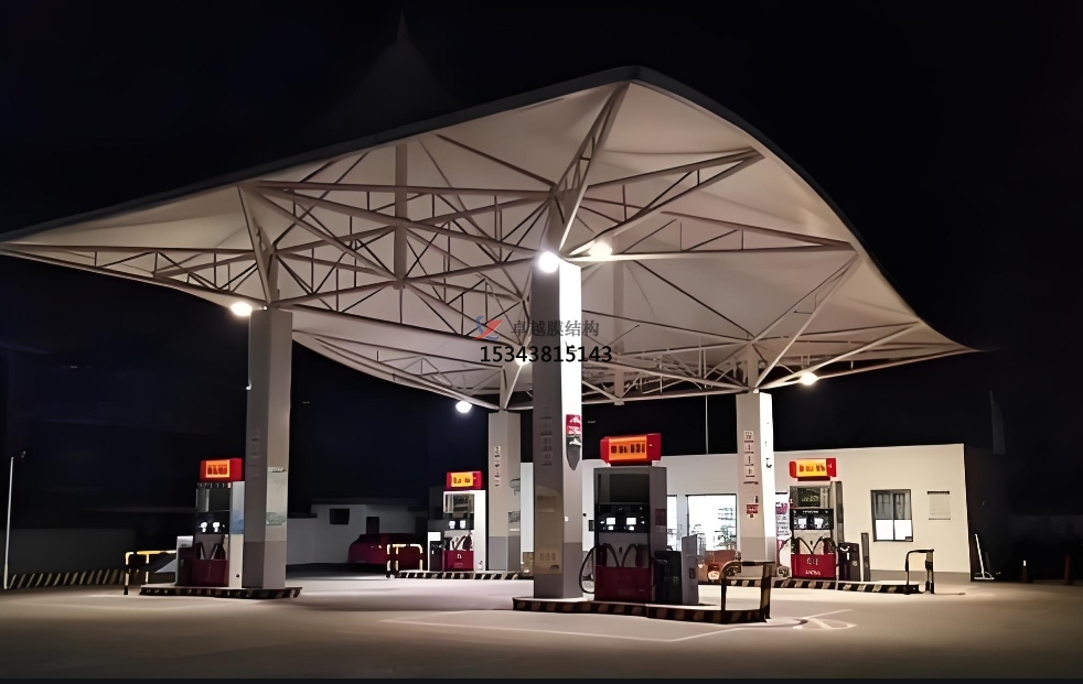 傳統(tǒng)加油站:在傳統(tǒng)加油站建設(shè)中,膜結(jié)構(gòu)頂棚已成為主流選擇。其卓越的耐候性和自潔性能,能始終保持加油站外觀整潔;良好的透光性優(yōu)化了室內(nèi)照明條件,提升加油作業(yè)效率;堅固的結(jié)構(gòu)設(shè)計確保了設(shè)施的耐用性和安全性,為加油站的長期穩(wěn)定運(yùn)營提供有力保障。