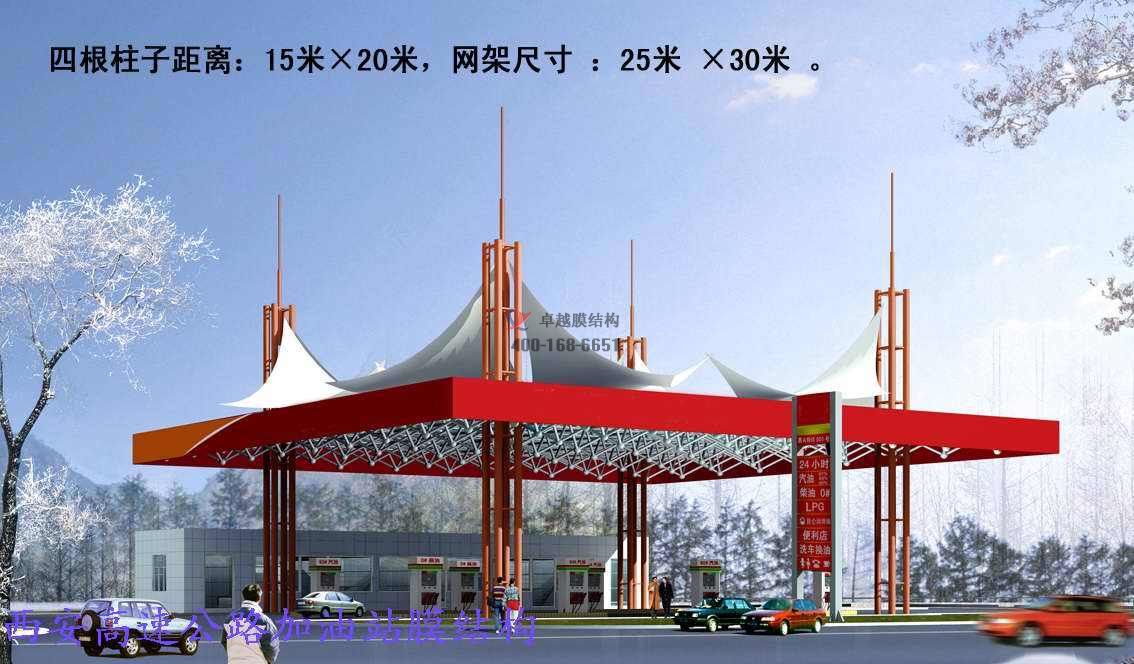 項(xiàng)目結(jié)構(gòu)形式:骨架式膜結(jié)構(gòu)加油站加氣站,四面自然排水,一側(cè)與站房搭接。