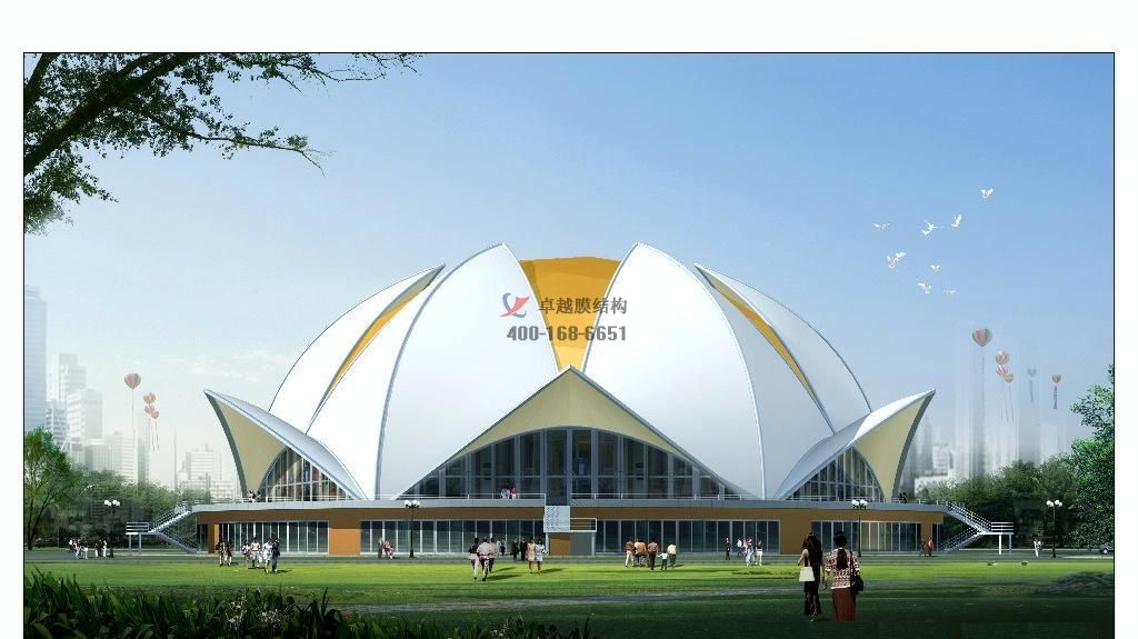 1.膜結(jié)構(gòu)景觀突破了傳統(tǒng)的建筑結(jié)構(gòu)形式,具有造型優(yōu)美、飄逸自然、融藝術(shù)、力學于一體,富有時代氣息被譽為21世紀的現(xiàn)代高科技綠色建筑。