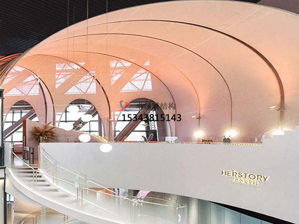 人們發(fā)現(xiàn)算很多的一些商場,包括一些公共區(qū)域,它在進行一些休閑空間搭建時,使用的也是張拉膜結(jié)構(gòu)在進行修建。主要是因為它的造型非常的漂亮,而且我們在對它進行搭建時,也可以感受到它搭建出來之后的整體空間比較大,實用性很大。而且自己在修建過程當中,投入的成本比較低,是比較劃算的一種建筑方法和建筑特點.