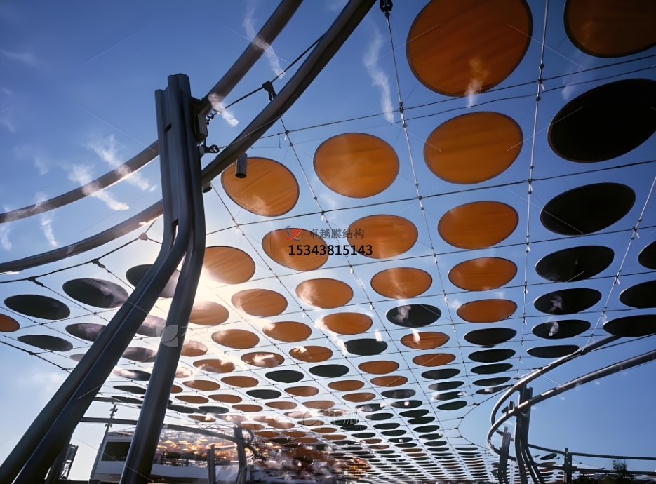 景觀膜結(jié)構(gòu)主要由膜材、骨架系統(tǒng)與支撐系統(tǒng)協(xié)同構(gòu)成。膜材作為核心部分,多選用聚酯纖維、聚氯乙烯等材料。聚酯纖維膜材強(qiáng)度高,能有效抵御外界拉力,保障結(jié)構(gòu)穩(wěn)固;聚氯乙烯膜材則具備良好的柔韌性與可塑性,可輕松塑造出各種復(fù)雜造型。同時,這些膜材還擁有出色的耐久性,能經(jīng)受住長時間的風(fēng)吹日曬、雨水侵蝕,確保景觀膜結(jié)構(gòu)的長期使用。