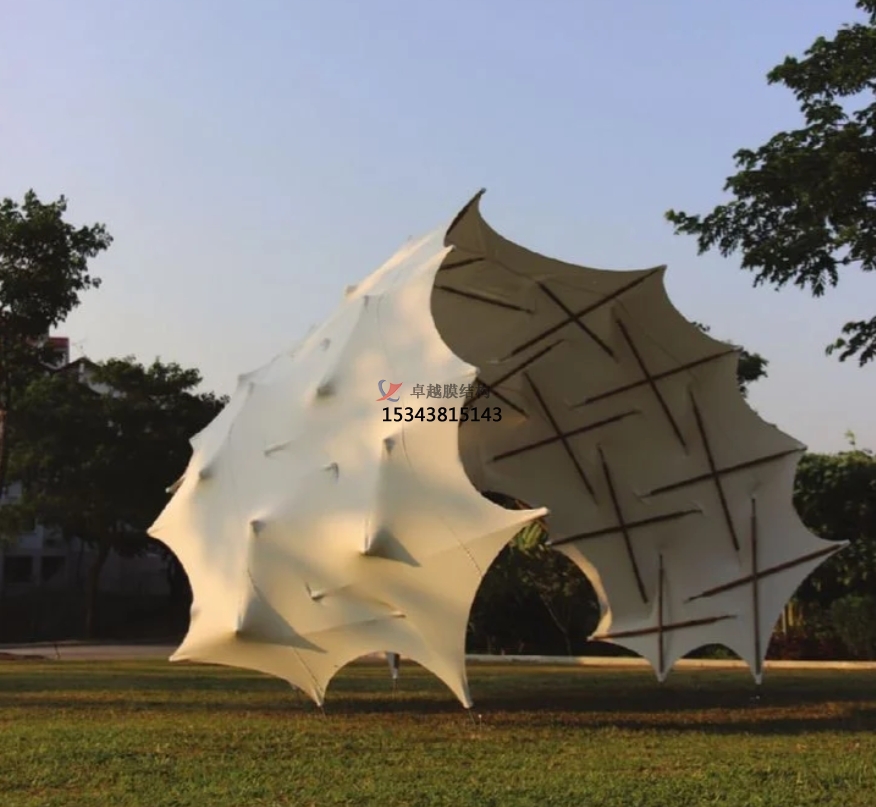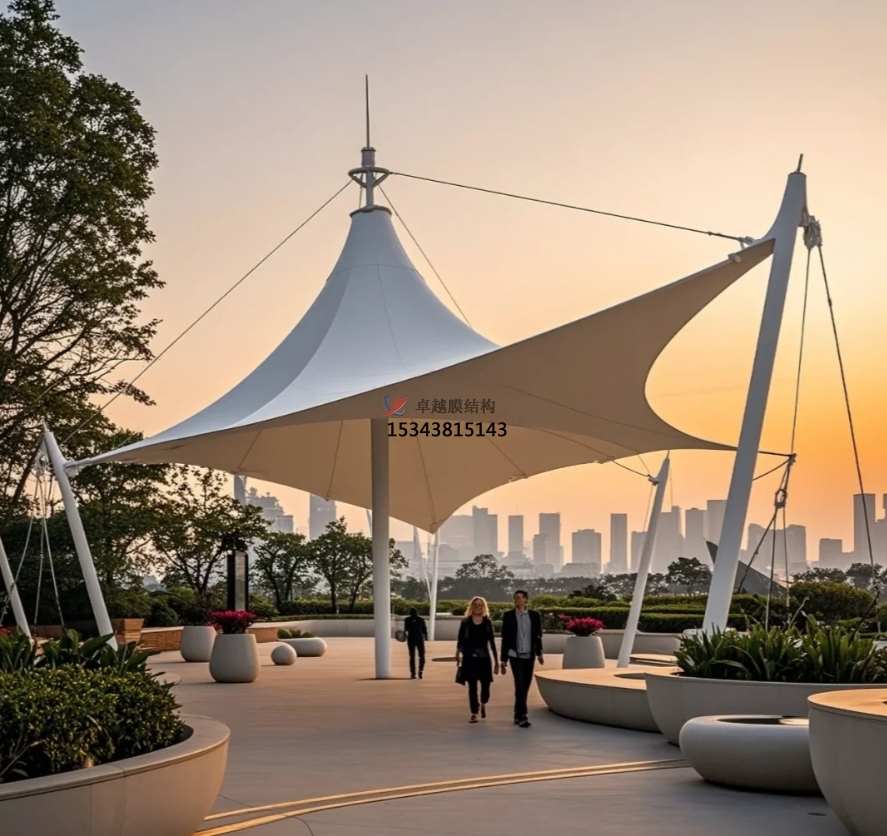 輕質(zhì)高強(qiáng),穩(wěn)固耐用:景觀膜結(jié)構(gòu)采用的高強(qiáng)度薄膜材料,重量僅約為傳統(tǒng)建筑結(jié)構(gòu)材料的十分之一,極大地減輕了自身重量。但 “輕量級” 的它卻有著超乎想象的強(qiáng)大實(shí)力,拉伸強(qiáng)度極高,在面對風(fēng)荷載與雪荷載時,能憑借出色的韌性與剛性,展現(xiàn)卓越的穩(wěn)定性。在強(qiáng)風(fēng)天氣中,膜結(jié)構(gòu)可通過自身的柔性變形來緩沖風(fēng)力,避免因剛性抵抗而導(dǎo)致結(jié)構(gòu)損壞;面對積雪,其合理的造型與支撐設(shè)計(jì)能使積雪均勻分布或自然滑落,防止因積雪過重造成坍塌,為景觀設(shè)施提供可靠的安全保障。