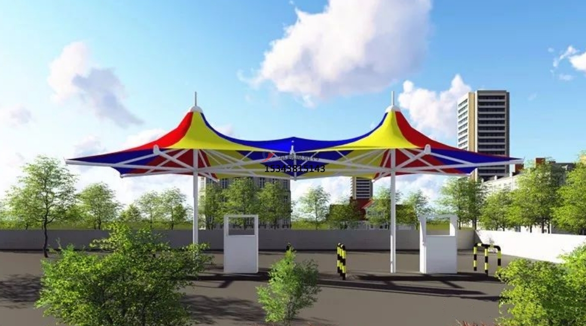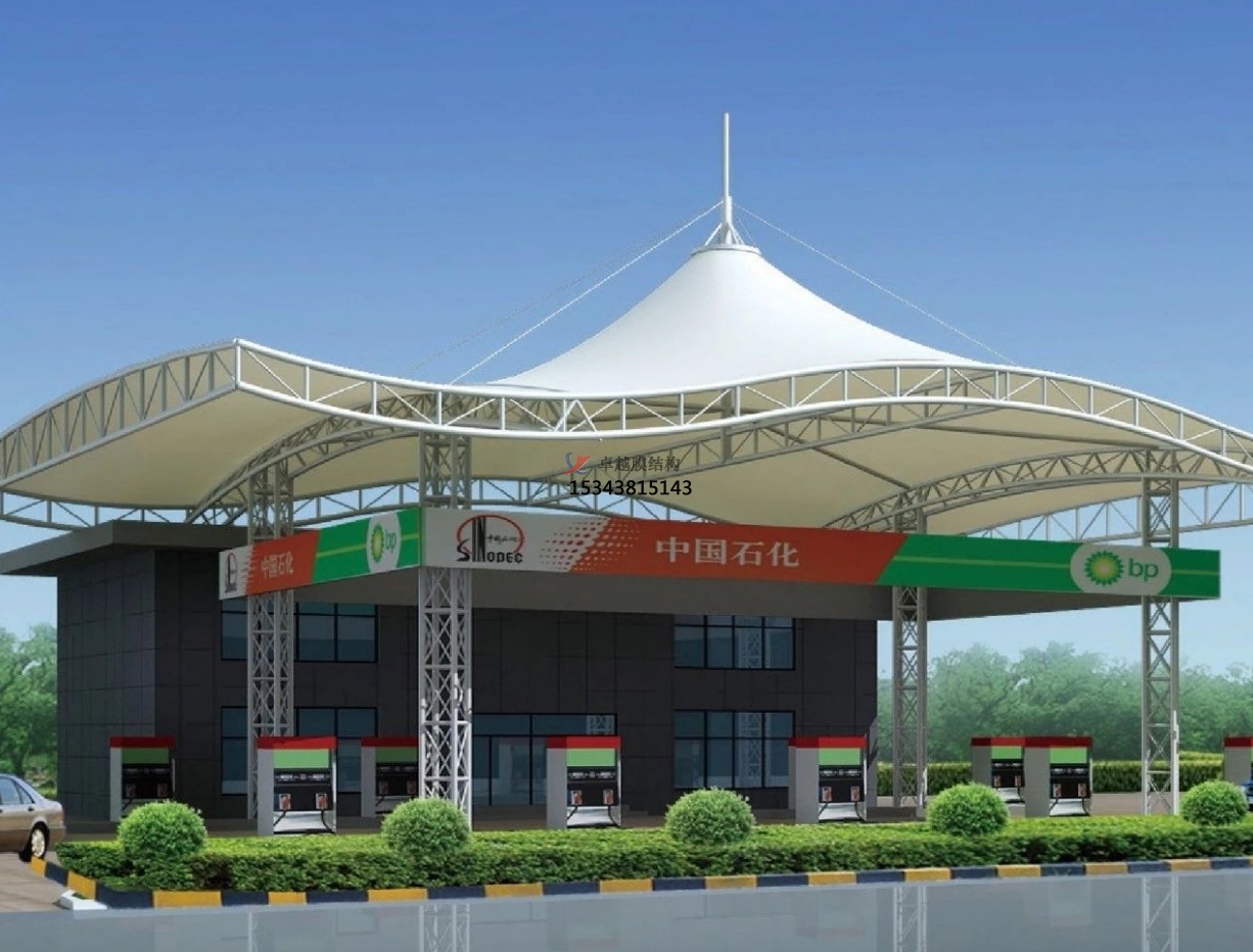 加油站的膜結構適合采用的形式有:多點對稱拋物面、組合拋物面、馬鞍形拋物面錐形雙曲拋物面、拱支承型等等。膜結構的鋼構件、膜面及其它零配件都是工廠預制件,安裝方便,施工時間很短。非常適合工期緊,需要短時間投入運營的加油站工程。