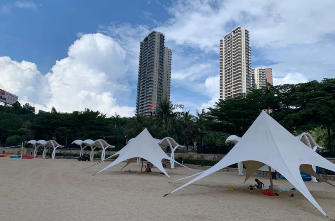 景觀棚膜結(jié)構(gòu)最大的特點(diǎn)之一就是其幾乎不受限制的造型能力。設(shè)計(jì)師可以根據(jù)不同的場(chǎng)地需求、文化背景以及功能要求,創(chuàng)造出如貝殼般優(yōu)雅的曲線、如帆船般靈動(dòng)的輪廓、如花朵般綻放的形態(tài)等等。這種獨(dú)特的造型不僅能夠成為視覺(jué)上的焦點(diǎn),提升整個(gè)區(qū)域的景觀品質(zhì),還能很好地與周圍的自然環(huán)境或建筑風(fēng)格相融合,形成和諧統(tǒng)一的整體畫(huà)面。