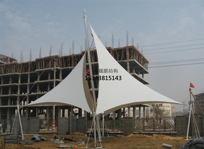 這是我司太原及周邊地區(qū)完工的膜結構景觀工程案例,膜結構景觀給人們對白色或米白色膜材會有很好的色彩感知,因為這兩種色彩表現(xiàn)出對可見光具有線性光譜透射的特點。透射程度隨透射光波長的增加而增加,這使得透射光比人射光還略溫暖。透射光譜與纖維及其特點、涂層的厚度以及附加面層有關,相對于傳統(tǒng)涂理PVC的聚醋纖維膜材,涂覆PTFE的玻瑞纖維膜材的透射光譜更加均勻具有外觀新穎,經濟適用,適用壽命長,節(jié)能透光等優(yōu)點。深受廣大用戶的好評,我司所有工程全部通過專業(yè)膜結構軟件計算通過,結構安全,質量可靠。
