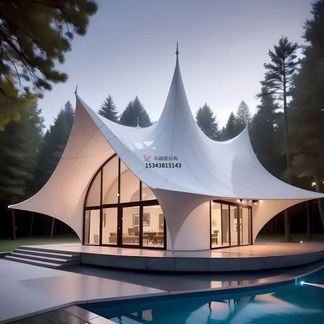 比如在膜結(jié)構(gòu)遮陽廊道下,光影隨時間流轉(zhuǎn)而變幻,行人漫步其間,仿若置身藝術(shù)殿堂。夜幕降臨,景觀照明開啟,膜結(jié)構(gòu)又展現(xiàn)出別樣光影畫卷。內(nèi)部燈光透射使膜結(jié)構(gòu)仿若發(fā)光燈籠,柔和光線暈染周邊,營造溫馨浪漫氛圍;外部燈光投射則借助膜材反射折射特性,在膜面形成絢麗光影圖案,如星空、花朵等,為夜景增添神秘奇幻色彩。