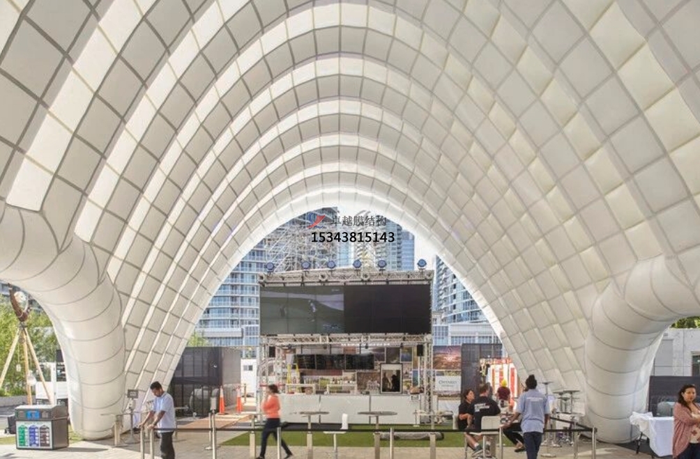 戶外充氣膜的核心結(jié)構(gòu)基于高強(qiáng)度的薄膜材料,通過內(nèi)部持續(xù)充氣產(chǎn)生壓力差,從而使膜體保持穩(wěn)定的形狀。這種薄膜材料通常具備出色的抗拉強(qiáng)度、抗紫外線性能以及耐候性,能夠抵御各種惡劣的自然環(huán)境。充氣膜的支撐系統(tǒng)相對簡潔,摒棄了復(fù)雜的鋼結(jié)構(gòu)或混凝土框架,僅依靠少量的錨固點(diǎn)與地面相連,大大簡化了施工過程,同時(shí)也降低了建筑成本。?
