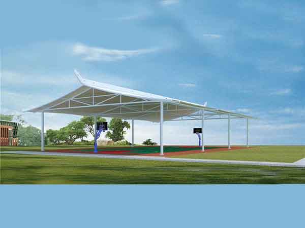籃球場(chǎng)膜結(jié)構(gòu)罩棚是指安裝在籃球場(chǎng)上方的膜結(jié)構(gòu),起到遮陽擋雨的作用。對(duì)于場(chǎng)地要求低,基本上所有籃球場(chǎng)地都可以做膜結(jié)構(gòu)頂棚,相比混凝土結(jié)構(gòu)的風(fēng)雨球館,施工周期更短,造價(jià)更低。膜的透光性比較好,所以可以保證場(chǎng)館內(nèi)的采光。先設(shè)計(jì),然后進(jìn)行材料加工,現(xiàn)場(chǎng)安裝,施工效率更高。下面介紹一下我們?cè)谌湛t市周邊縣市完工的一些籃球場(chǎng)膜結(jié)構(gòu)罩棚設(shè)計(jì)施工案例。