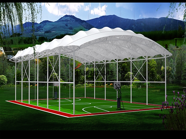 張拉膜的結(jié)構(gòu)空間形態(tài) ,張拉膜結(jié)構(gòu)的基本形態(tài)有鞍面、錐面、拱承面、波形面等。這些基本形態(tài)除了上迷的張拉膜結(jié)構(gòu)共同的空間特點(diǎn)之外還有著不同的空間形態(tài)特點(diǎn)。鞍形而張拉膜結(jié)構(gòu)的高點(diǎn)和低點(diǎn)都在膜面周邊,空間形態(tài)流暢開放,中央?yún)^(qū)域高度適中,空間利用率較高。錐形面高點(diǎn)在膜面中間,低點(diǎn)在周圍,空間形態(tài)比較內(nèi)聚。由于膜面中部升起較高,_且空間越向上越狹小,相對(duì)來說其內(nèi)部空間不容易被充分利用,拱承張拉膜膜面中央拱承部分較高,然后向兩邊逐漸降低,當(dāng)多個(gè)拱承膜面組合在一起時(shí)所形成的內(nèi)部空間比較容易被充分的利用,波形面張拉膜脊谷索交替排列,內(nèi)部空間也高低起伏,一般來說脊索和谷索間隔距離不會(huì)太大,波形部分空間很難被利用。 從上述的分析中我們發(fā)現(xiàn),雖然張拉膜結(jié)構(gòu)的結(jié)構(gòu)厚度是所有結(jié)構(gòu)形式中更小的,只有薄薄的一層膜的厚度,但是整個(gè)膜面結(jié)構(gòu)的高度卻比一般的結(jié)構(gòu)來的大(這里的膜面結(jié)構(gòu)高度指的是膜面結(jié)構(gòu)的更低點(diǎn)至級(jí)高點(diǎn)的長(zhǎng)度)。這是由于張拉腆結(jié)構(gòu)的膜面曲率越大,獲得同樣剛度所需要的預(yù)應(yīng)力越小.結(jié)構(gòu)越穩(wěn)定。為了減少膜面內(nèi)部應(yīng)力,增加結(jié)構(gòu)的穩(wěn)定性.張拉膜結(jié)構(gòu)必須保持合適的膜面曲率。錐形張拉膜.單元頂高度與平面跨度之比一般大于1:5,小于1:1鞍形面要中央平坦區(qū)城的曲面曲率大于3%。