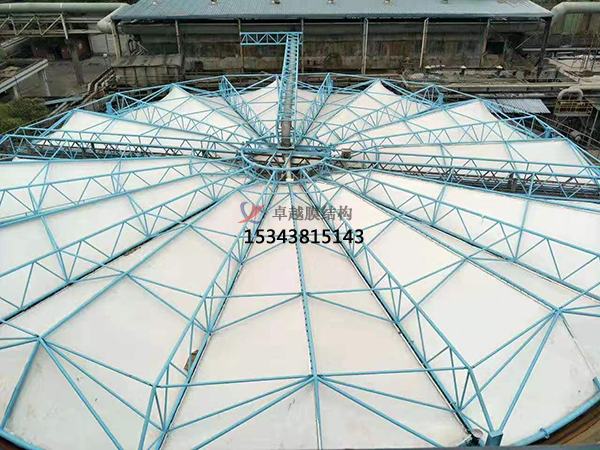 2、我公司利用膜結(jié)構(gòu)的輕巧,別致的造型建造各種半封閉,全封閉的不行空間;污水池反吊膜結(jié)構(gòu)中的高強(qiáng)度柔韌薄膜稱膜材,它是一種耐腐蝕、耐高溫、耐久用、高強(qiáng)度的樹脂類涂層織物,由多種復(fù)合PVC樹脂涂層刀刮成型,具有質(zhì)地柔韌、厚度小、重量輕、透光性好的特點(diǎn)。對(duì)自然光吸收和透射能力、阻燃;,具有良好的耐久、防火、氣密等特性;表面經(jīng)過特氟龍?zhí)幚砘蚨趸伩估匣幚?,具有較高的自清潔性能。下面就大家介紹一下我公司在泰安市地區(qū)完成的部分污水池膜結(jié)構(gòu)封閉項(xiàng)目。