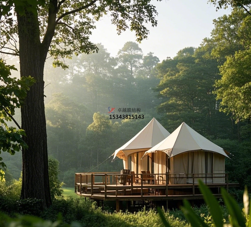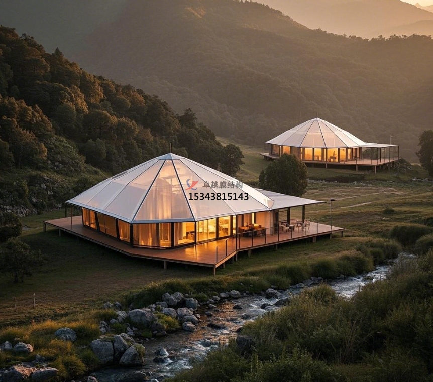 帳篷酒店膜結(jié)構(gòu)以其豐富多變的造型脫穎而出。設(shè)計靈感常來源于自然界,如白蟻巢穴、蜂巢、螢火蟲和蝸牛等生物形態(tài)。建筑師通過巧妙構(gòu)思,將這些元素融入設(shè)計,打造出方形帳篷、螺旋帳篷等獨特空間結(jié)構(gòu)。帳篷的輕盈、通透特質(zhì),與周圍自然環(huán)境完美呼應(yīng),形成一道獨特風(fēng)景線。像可見澤棲帳篷酒店,其客房 “水映螢火” 采用玻璃箱外蓋膜結(jié)構(gòu),既保證貼水居住的舒適感,又解決遮陽難題;“螺中洞天” 客房則運用雙層膜與保溫棉結(jié)構(gòu),滿足螺旋造型需求的同時,提升內(nèi)部舒適度,從不同角度展現(xiàn)出膜結(jié)構(gòu)在美學(xué)設(shè)計上的無限可能。