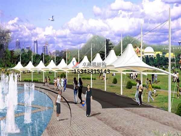 一個城市的中心區(qū)反映一個城市的地理風(fēng)貌和民族風(fēng)情,同時,也是一個城市文化發(fā)展程度的標(biāo)志。而景觀設(shè)計(jì)要求其具有廣泛的可讀性、雅俗共賞,既有超凡脫俗的藝術(shù)價值,又能使大眾喜聞樂見與大眾息息相通。膜結(jié)構(gòu)以其輕盈飄逸的造型、柔美并帶有力量的曲線和大跨度和大空間的鮮明個性和標(biāo)識性,應(yīng)用于城市小品設(shè)計(jì)中。
