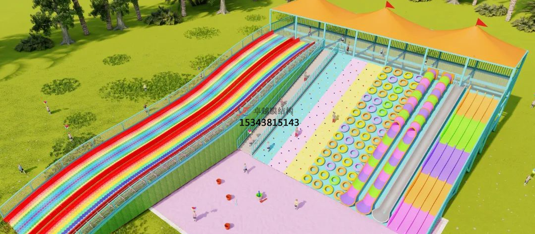 在張拉膜頂下方安裝彩虹滑道,滑道長度可根據(jù)客戶要求定制,一般可達(dá)120米?;啦捎梅阑?、耐磨的材料,保證游客的安全。